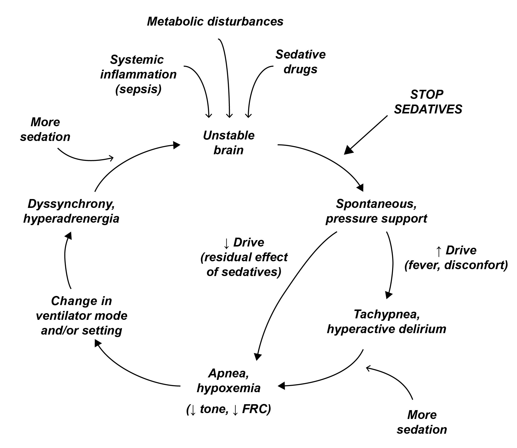 Muchas veces, confundimos el despertar con el destete. Así, inmediatamente después de suspender los sedantes cambiamos la modalidad a presión de soporte, y el paciente presenta un patrón de bradipnea con tiempos inspiratorios prolongados, o simplemente entra en apnea (Figura). Si el volumen corriente es pequeño, aumentamos el nivel de presión de soporte, lo que empeora el problema. La hipercarbia aguda lleva a taquicardia e hipertensión (hiperadrenergia!). Muchos agregan un agonista α-2 de acción central, antes de diagnosticar el problema y controlar la ventilación que, reconozcamos, no es fácil. Entramos en el círculo vicioso del cerebro aún inestable, que lleva a más sedación, delirium y asincronía
