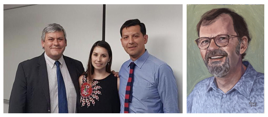 Figura: Durante la defensa de su tesis, de izq a der: Gonzalo Valdivia, Director Magíster en Epidemiología UC, la laureada Leyla Alegría, y Ricado Castro, tutor y jefe de nuestra UPC. A la derecha, el profesor Brochard, speaker en nuestro diplomado de Terapia Ventilatoria.