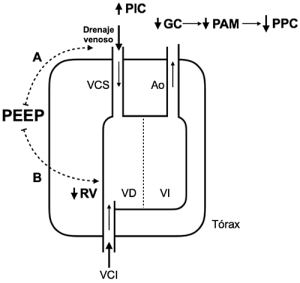 En esta particular situación, el uso de PEEP suele ser motivo de controversia, ya que teóricamente, el aumento en la presión positiva intratorácica secundario al uso de PEEP puede disminuir el retorno venoso, ocasionando una caída del débito cardíaco y la presión de perfusión cerebral (PPC), y por otra parte, disminuir el drenaje venoso cerebral y aumentar la presión intracraneana (PIC) (Figura 1).