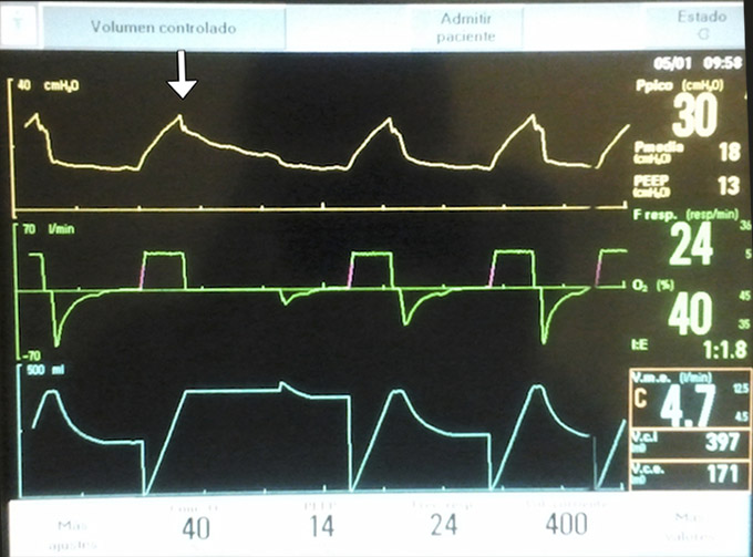 Figura: Registro de presión, flujo y volumen en un paciente con SDRA, que desarrolló una FBP durante su evolución. Se evidencia ausencia de una meseta al hacer una pausa inspiratoria (flecha), y una fuga superior al 50% (Vt inspirado 397, vs espirado 171 ml). La disminución del PEEP de 14 a 6 cmH2O disminuyó la fuga y probablemente facilitó el cierre espontáneo de la fístula.