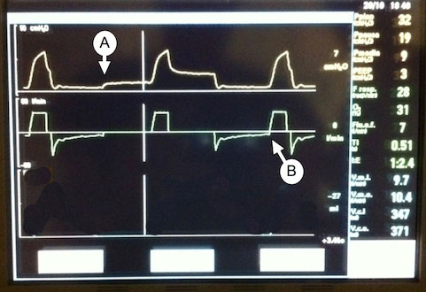 Figura:  Curvas de presión y flujo en función del tiempo durante ventilación controlada por volumen. Al hacer una pausa espiratoria (A), cesa el flujo espiratorio y se equilibran las presiones alveolares y de vía aérea, pudiendo cuantificarse el nivel de auto-PEEP.  El auto-PEEP puede ser fácilmente detectado por la presencia de flujo espiratorio al inicio del siguiente ciclo inspiratorio (B).
